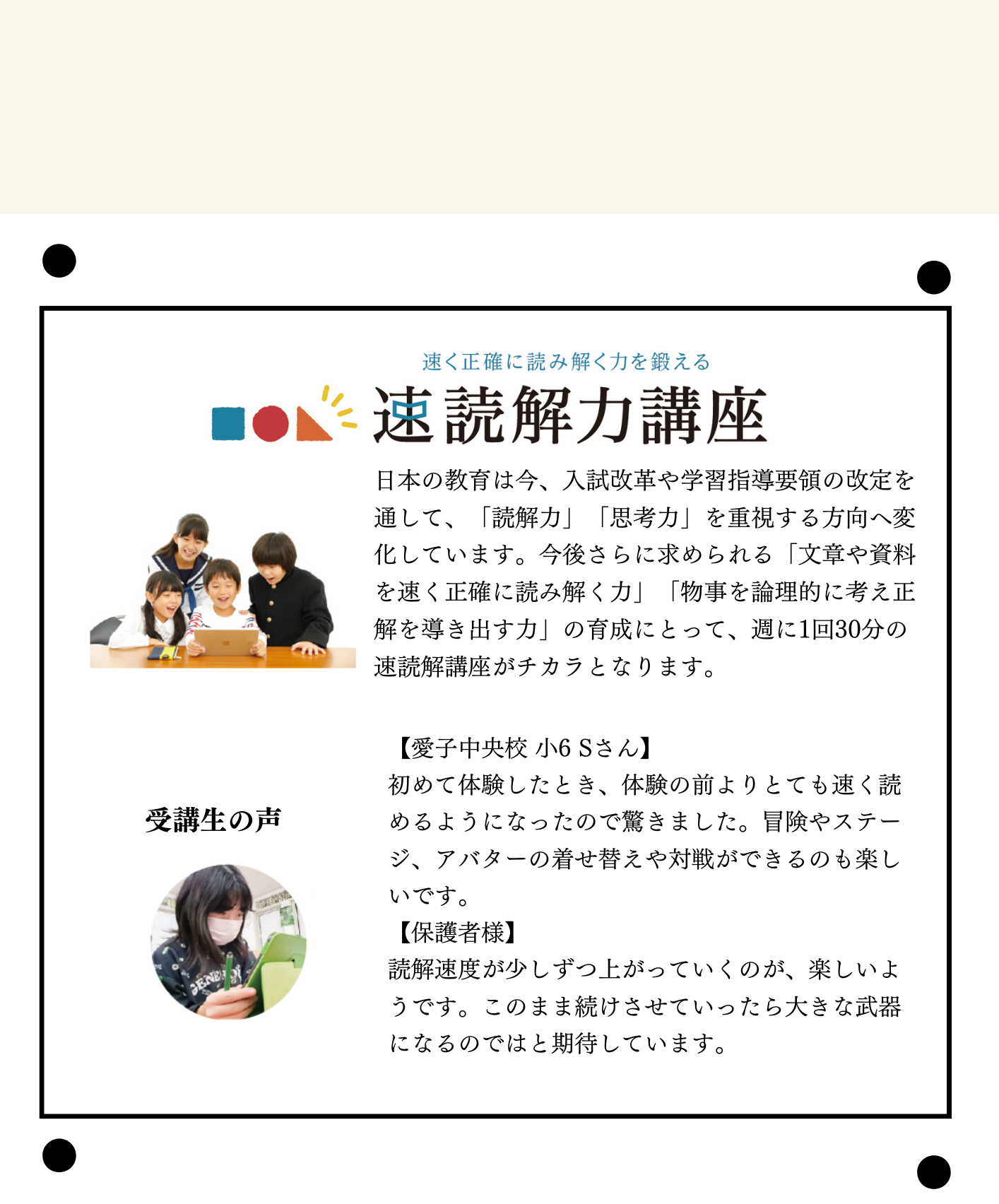日本の教育は今、入試改革や学習指導要領の改定を通して、「読解力」「思考力」を重視する方向へ変化しています。今後さらに求められる「文章や資料を速く正確に読み解く力」「物事を論理的に考え正解を導き出す力」の育成にとって、週に1回30分の速読解講座がチカラとなります。
