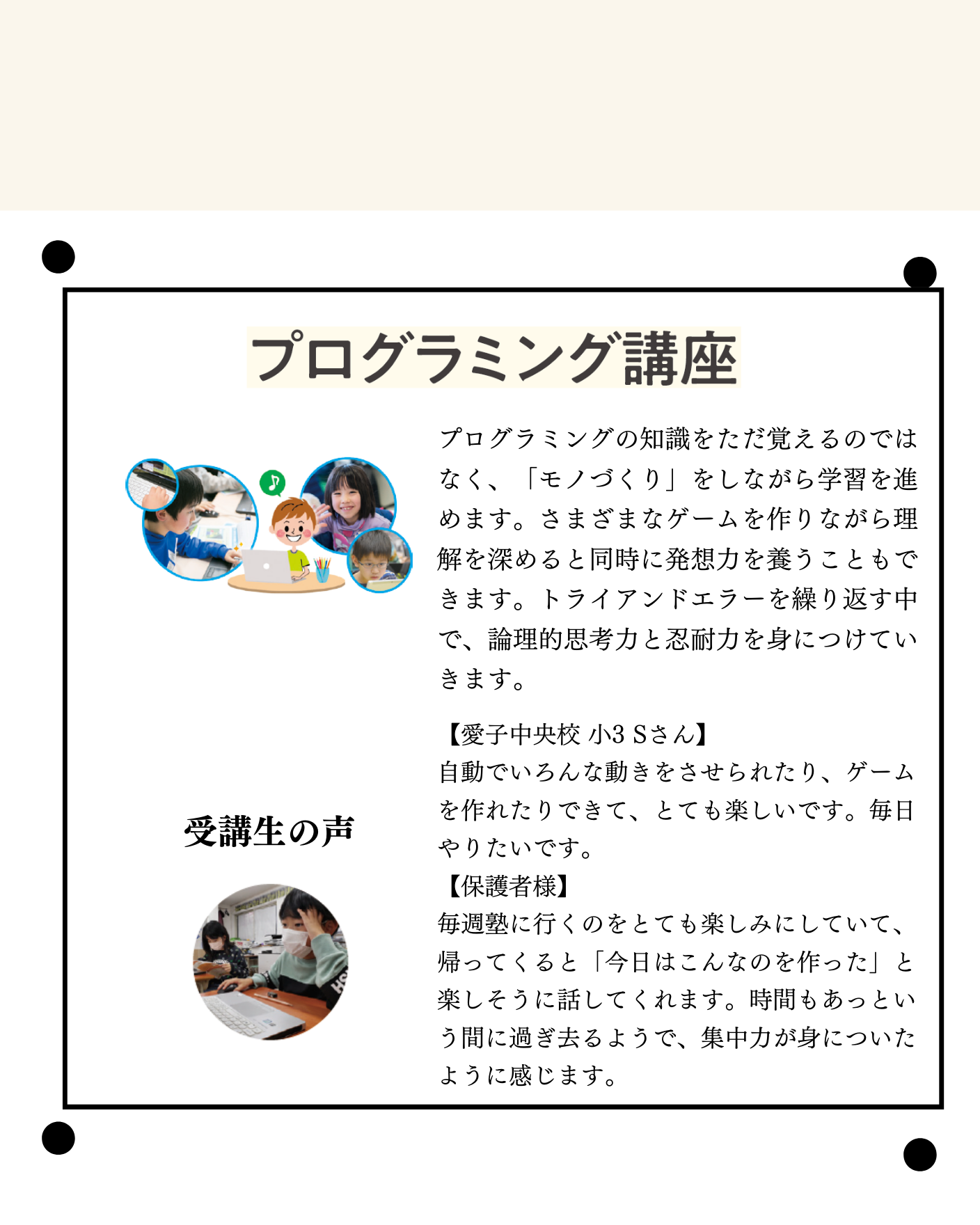 プログラミング講座ではパソコンのマウスの使い方も知らないところからのスタートでしたが、慣れるのが早かったです。ほとんど助けず、テキストを読みながら進めていたのでよくできているプログラムだと思いました。作文が大の苦手でしたが、最後には作文ができあがるという文達マジックを子供が実感できたようでよかったです。