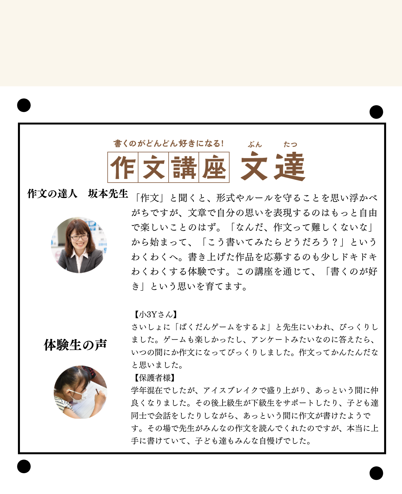 毎週塾に行くのをとても楽しみにしていて、帰ってくると「今日はこんなのを作った」と楽しそうに話してくれます。時間もあっという間に過ぎ去るようで、集中力が身についたように感じます。「作文」と聞くと、形式やルールを守ることを思い浮かべがちですが、文章で自分の思いを表現するのはもっと自由で楽しいことのはず。「なんだ、作文って難しくないな」から始まって、「こう書いてみたらどうだろう?」というわくわくへ。書き上げた作品を応募するのも少しドキドキわくわくする体験です。この講座を通じて、「書くのが好き」という思いを育てます。