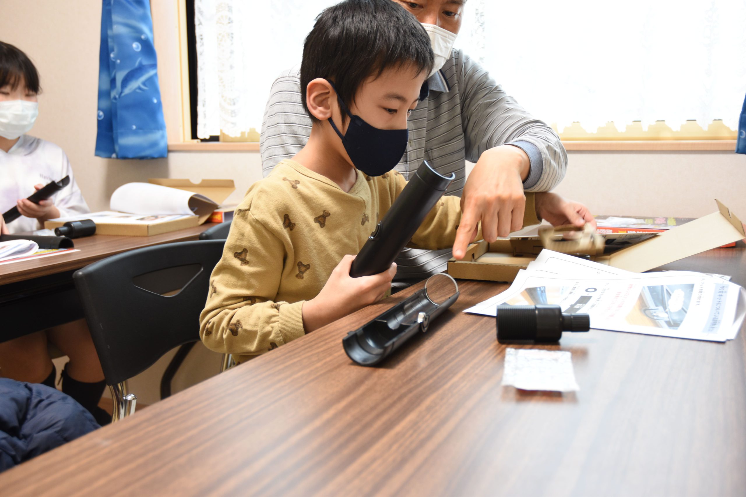 間違いやすい組立工程ではスタッフによる確認を行い確実に完成まで導きます。作った望遠鏡は勿論プレゼント!夏の自由研究やお子様の探究学習にお役立てください!