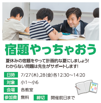 何事もスタートダッシュが肝心ですから、夏休みのはじめに、このイベントに参加して宿題をする習慣を身につけてください!
