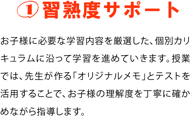 お子様に必要な学習内容を厳選背板個別カリキュラムに沿って学習を進めていきます。授業では、先生が作る「オリジナルメモ」とテストを活用することで、お子様の理解度を丁寧に確かめながら指導します。