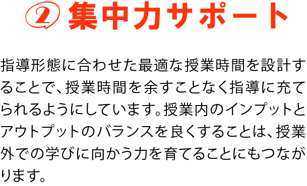 指導形態に合わせた最適な授業時間を設計することで、授業時間を余すことなく指導に充てられるようにしています。授業内のインプットとアウトプットのバランスを良くすることは、授業外での学びに向かう力をそだてることにもつながります。