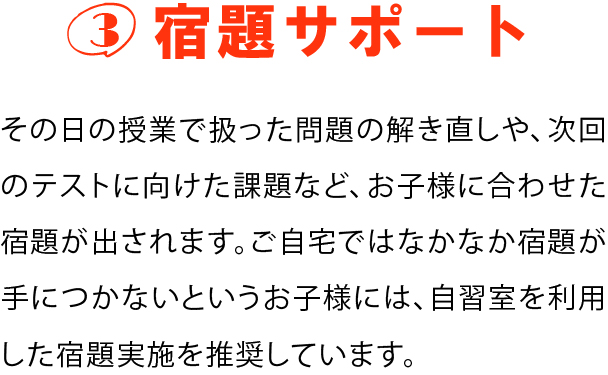その日の授業で扱った問題の解き直しや、次回のテストに向けた課題など、お子様に合わせた宿題が出されます。ご自宅ではなかなか宿題が手に付かないというお子様には、自習室を利用した宿題を推奨しています。