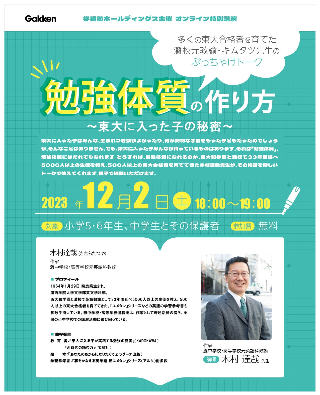 東大に入った子はみんな、生まれつき頭がよかったり、何か特別な才能をもった子どもだったのでしょうか。そんなことはありません。でも、東大に入った子みんなが持っているものはあります。それは「勉強体質」。勉強体質にはだれでもなれます。どうすれば、勉強体質になれるのか、西大和学園と灘校で33年間延べ5000人以上の生徒を教え、500人以上の東大合格者を育ててきた木村達哉先生が、その秘密を楽しいトークで教えてくれます。親子で視聴いただけます。