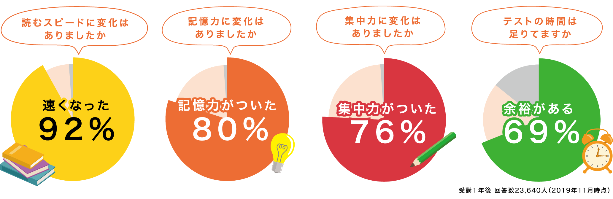 毎回多くの文字に触れるので、自然と文字に対する抵抗がなくなります。また、速度が上がればより多くの本を読むことができ、さらに読解力の向上にもつながります。