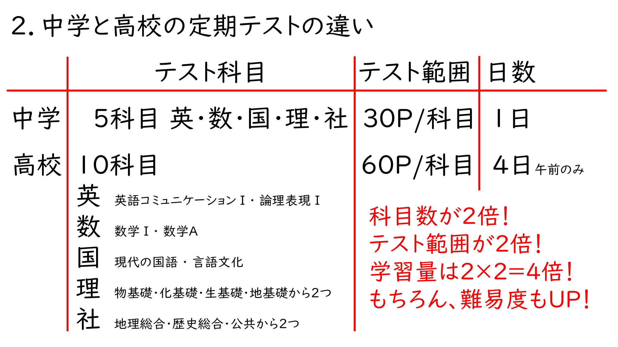 何が問題かというと中学校の定期テストを経験している分、「高校は全然違うよ」と伝えてもなかなか今までの経験と異なることは受け入れづらいからです。