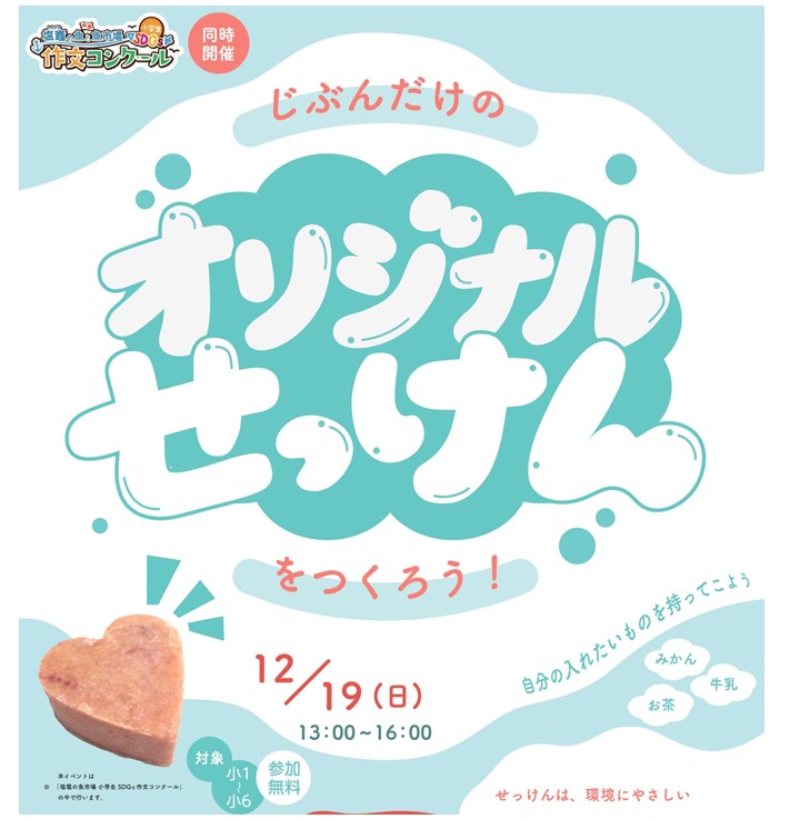 参加方法は、教室で参加(12/19(日)13:00~16:00 オリジナル石鹸作りイベント付)か、ご自宅で動画を見て参加か、いずれかお選びいただけます。参加申し込み〆切は12/18(土)まで、こちらからお願いいたします。