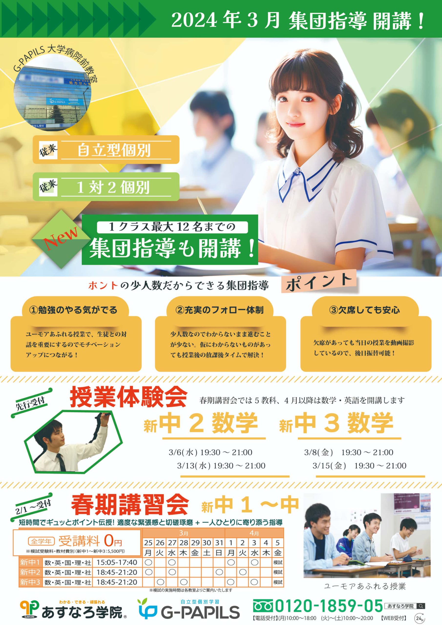 2024年春期講習会から対面集団指導、自立型個別、対面個別の3形態で実施することにしました。