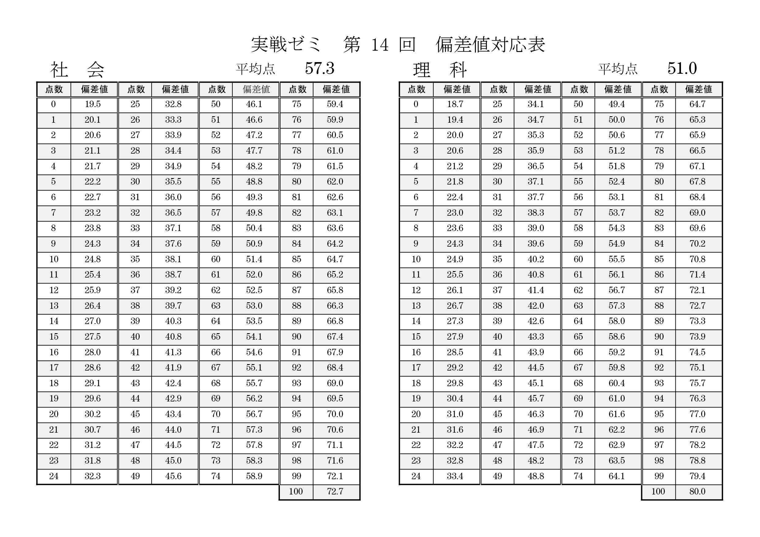 実戦ゼミでは、毎回テスト結果を集計し、平均点・偏差値一覧と塾内ランキングを作成します。