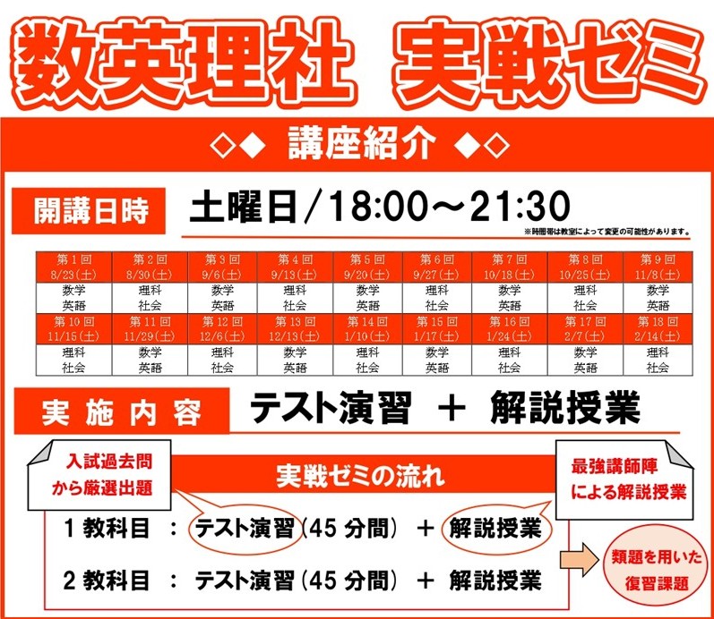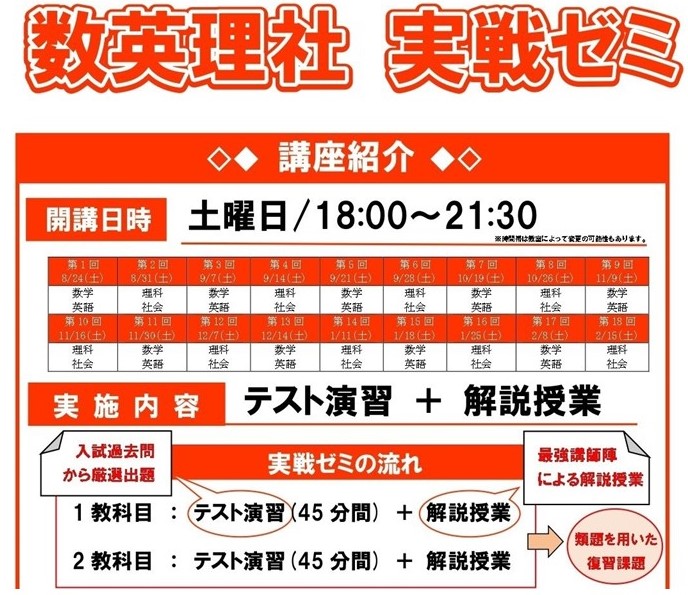 あすなろ学院の中3入試対策講座「数英理社実戦ゼミ」では、数学、英語、理科、社会のそれぞれでテスト演習と解説授業を行います。