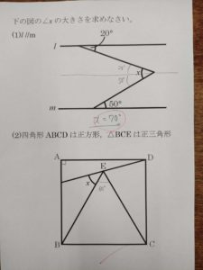 今回の(2)も「正三角形の60°を他の2か所も書く」「辺が等しい記号を書いてみる」などしたら解き方がわかったかもしれません。
