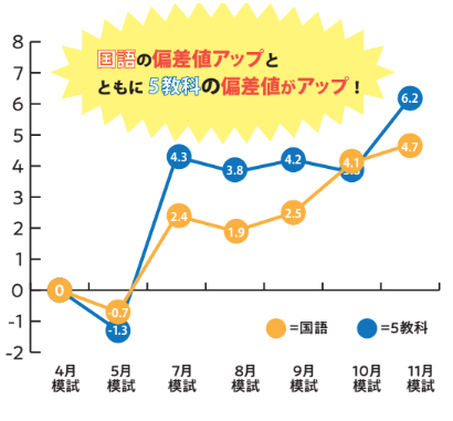 そして国語の偏差値アップは、5教科の偏差値アップへとつながっているのです。