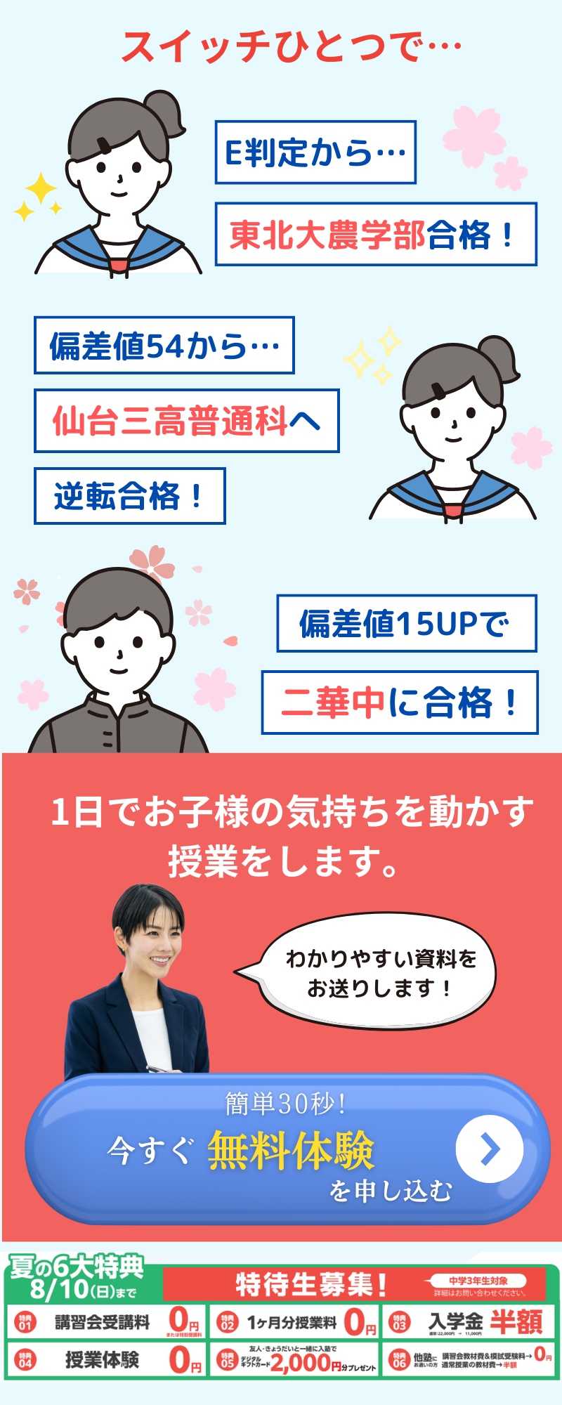 お知らせ 2025-05-25 ※備考欄に「夏期講習希望」とご記入ください。受講コースのご希望ありましたら、あわせてご記入ください。 宮城・仙台の塾ならあすなろ学院!夏期講習会募集中。小学生・中学生・高校生の集団指導・個別指導に自信あり!