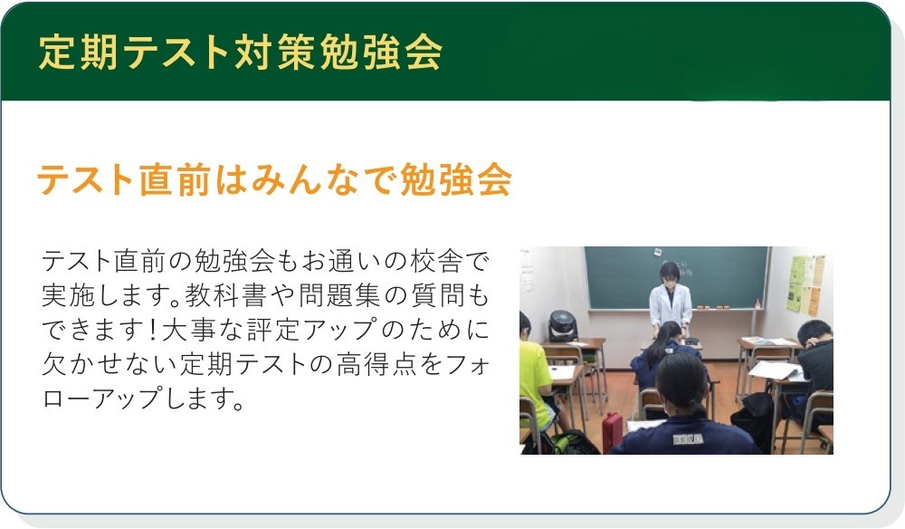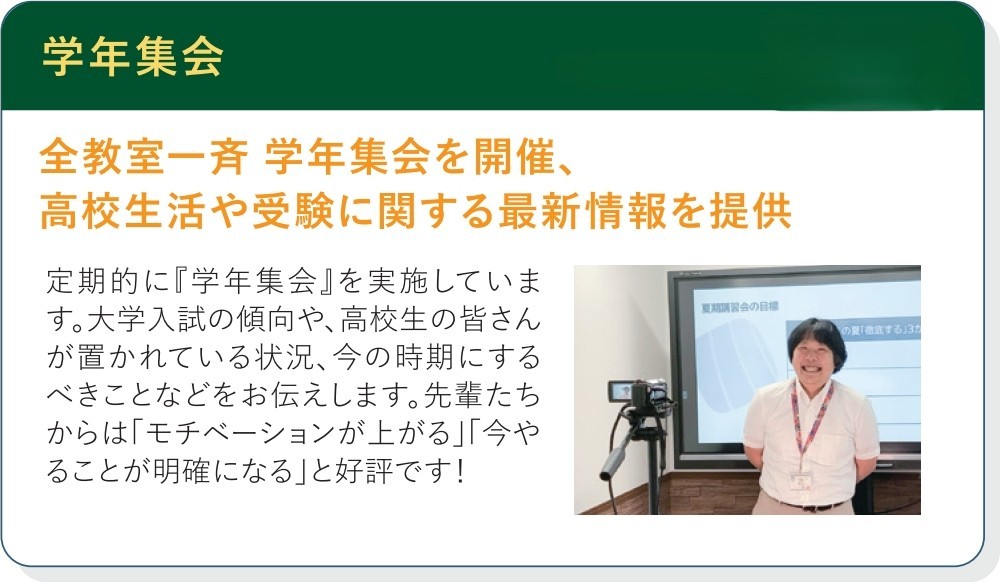 ほかにも、定期テスト前の対策勉強会や、定期開催の学年集会による受験の最新情報の提供など、