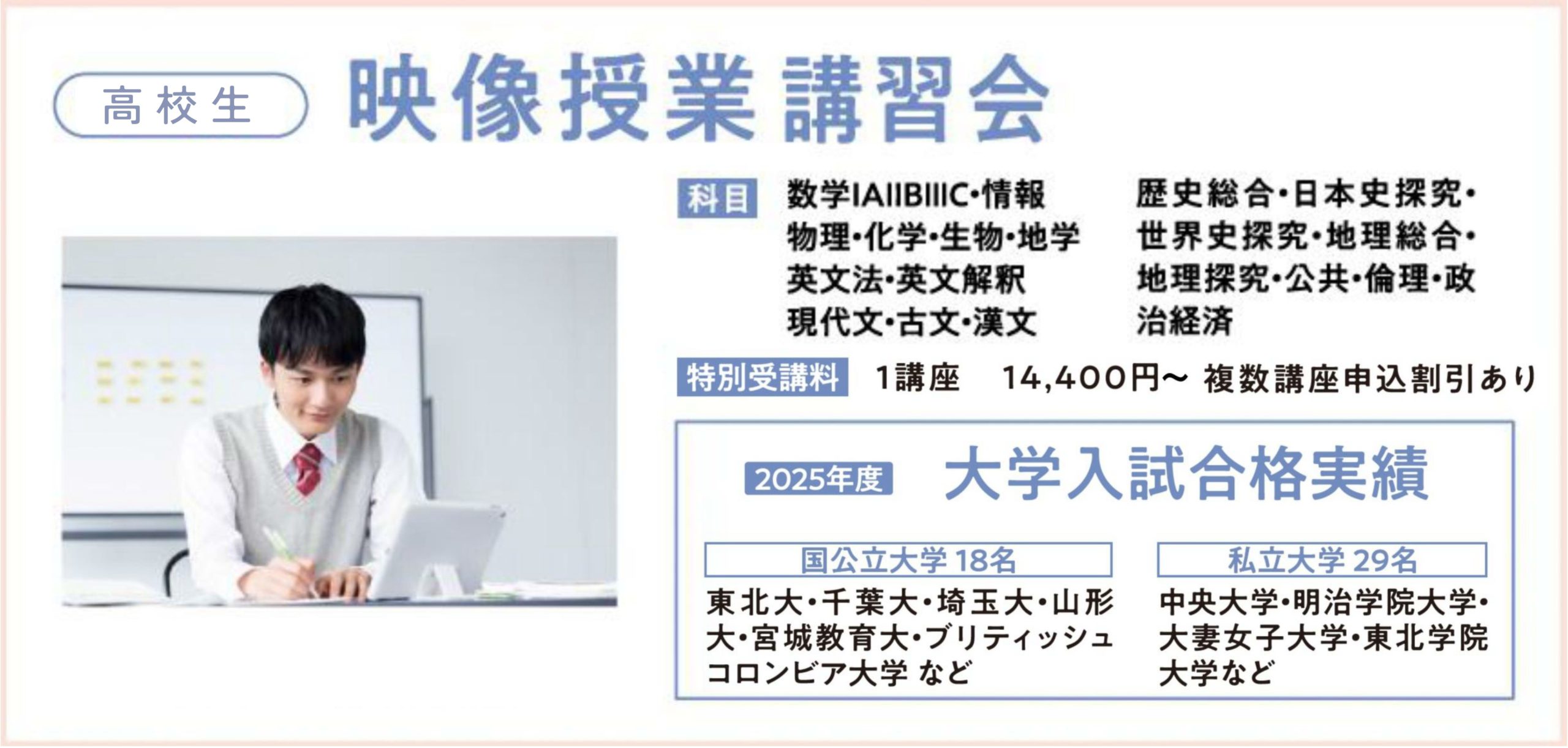 あすなろ学院・高校生コースの講習会は、首都圏の予備校で活躍するトップ講師の映像授業が受講し放題です。