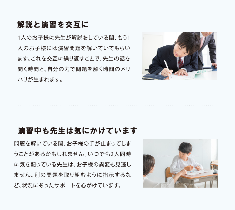 ※ 先生1人×生徒2人(1回:100分)、先生1人×生徒1人(1回:50分)
